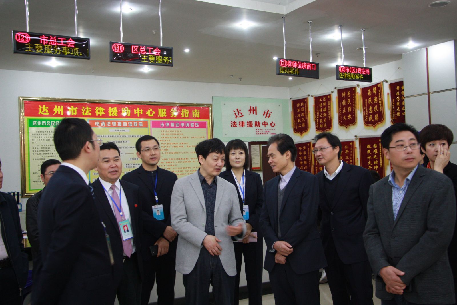 底瑜一行来到中心服务大厅,实地查看大厅整体运行及规范化建设情况,在中心法律援助服务窗口,底瑜与中心工作人员亲切交谈,详细询问窗口人员工作情况,仔细了解窗口运行管理模式、职能职责和向弱势群体提供法律诉讼等情况。当得知中心法律援助服务窗口今年已接待法律援助案件1000多件,并可登录中心网站通过流水号查询案件办理情况时,底瑜对中心法律援助窗口工作取得的显著成绩给予了高度评价。
